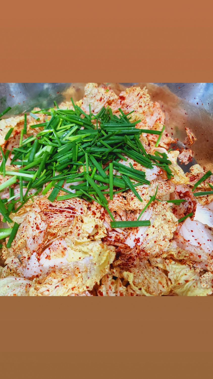 Limpia y corta las cebolletas en trozos de aproximadamente 5 cm. La combinación del repollo crujiente y las cebolletas enriquecerá el sabor del kimchi.