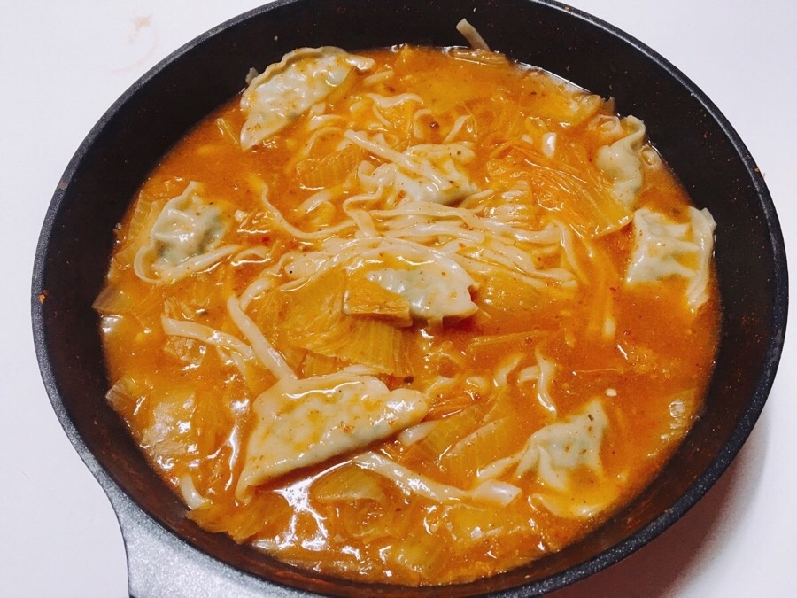 Añade el kimchi picado al caldo de anchoas y algas preparado y llévalo a ebullición a fuego medio. Deja que hierva a fuego lento hasta que el kimchi se ablande y su sabor refrescante impregne el caldo.