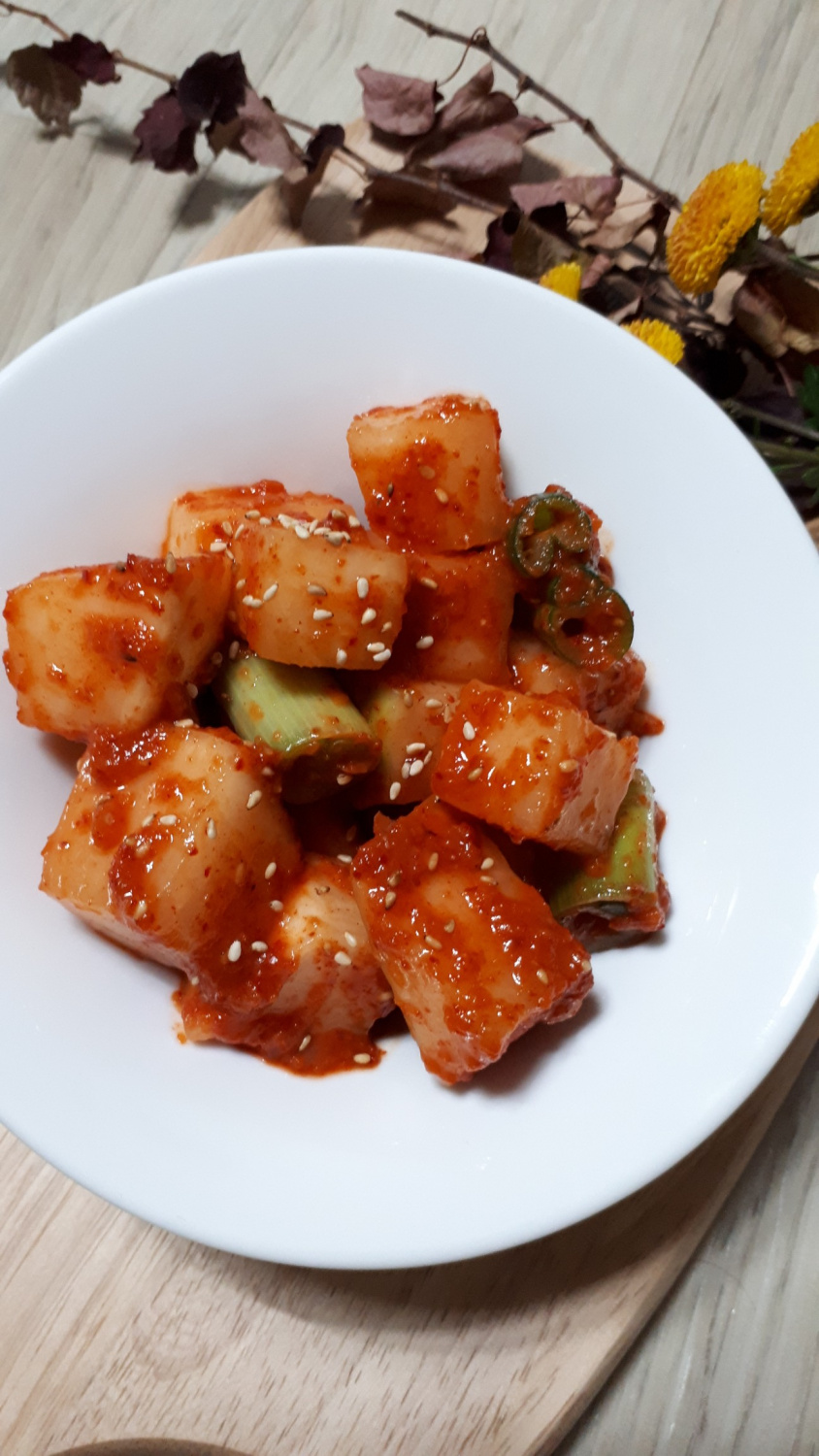 Kkakdugi con Leche de Soja (Kimchi de Rábano en Cubos)