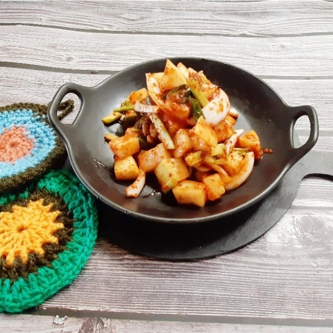 ¡Y así de simple, su delicioso kkakdugi está completo! Está sabroso de inmediato, pero dejarlo fermentar en el refrigerador durante aproximadamente un día desarrollará un sabor aún más rico. Este kkakdugi combina perfectamente con todo, desde arroz caliente hasta guisos, ofreciendo una deliciosa experiencia culinaria.