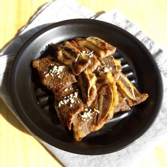 ¡Es hora de asar a la parrilla! Caliente una sartén ligeramente engrasada a fuego medio. Agregue el LA Galbi marinado, teniendo cuidado de no llenar demasiado la sartén. Asar a fuego medio en lugar de alto evita que se queme y asegura que la carne se cocine hasta obtener una perfección tierna y jugosa. Voltee las costillas ocasionalmente hasta que estén doradas y caramelizadas de manera apetitosa. Si no tiene sartén, también puede usar un horno o freidora de aire.