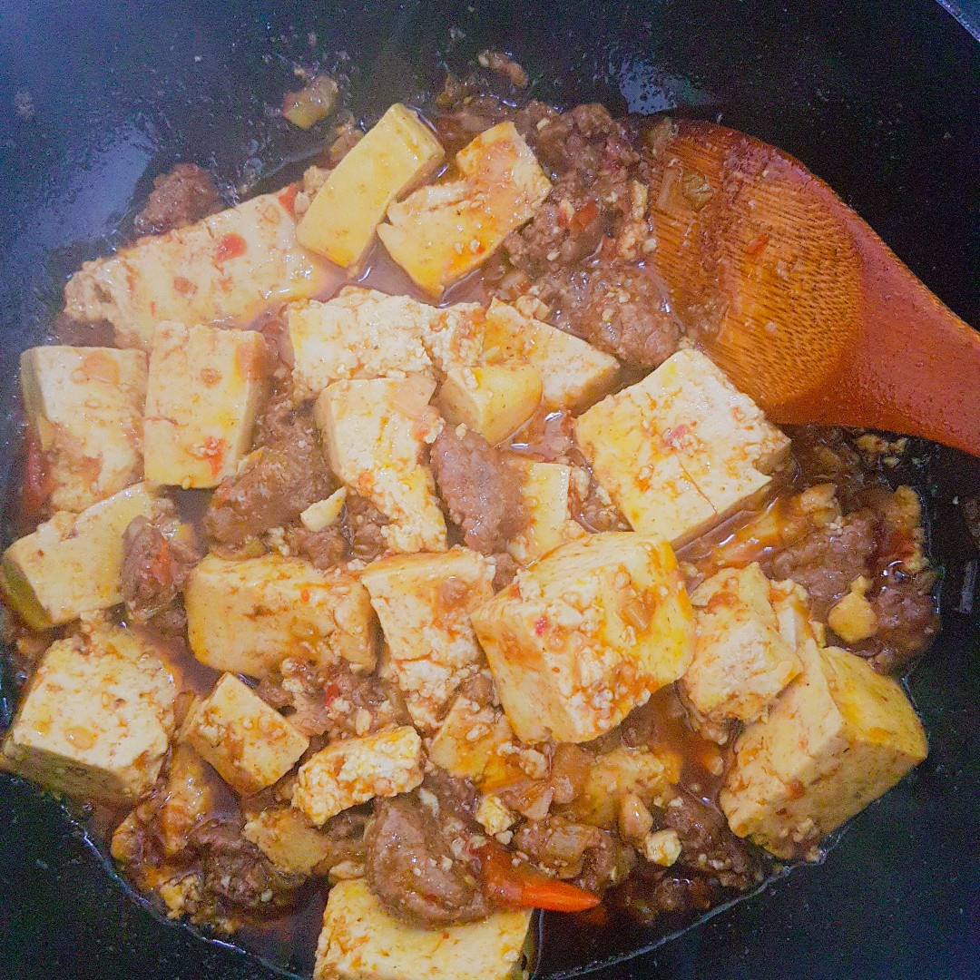 Cuando la carne de cerdo esté bien dorada, vierte 1 taza (200ml) de agua. Añade 1 cucharada de Doubanjiang, 1 cucharada de salsa de ostras, 1 cucharada de salsa de soja, 1 cucharada de azúcar, 1 cucharada de extracto de ciruela y 1 cucharada de vino de cocina. Revuelve para combinar las salsas y, una vez que la mezcla comience a hervir, agrega con cuidado el bloque de tofu, cortado en trozos del tamaño de un bocado (aproximadamente 2-3 cm). Revuelve suavemente y cocina a fuego lento durante unos 5 minutos para que el tofu absorba los sabores.