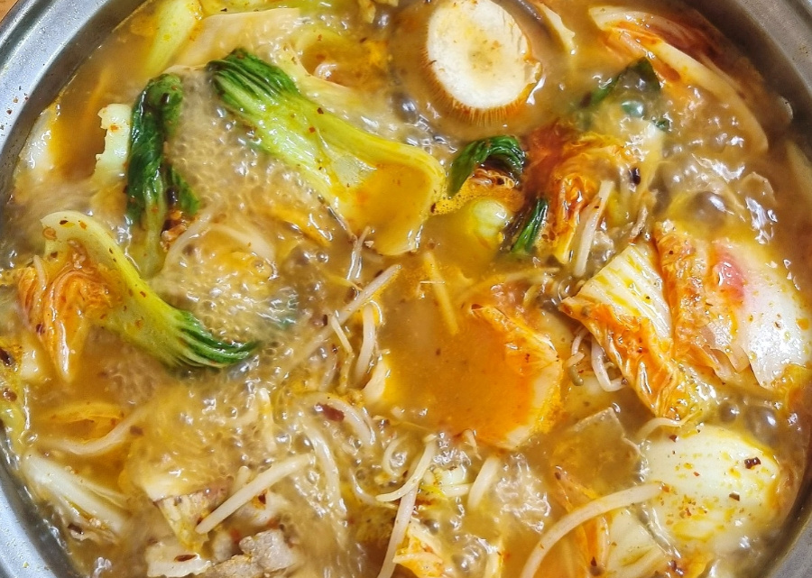 Lleva la sopa a ebullición. Una vez que hierva, añade todos los ingredientes adicionales que hayas elegido, como el Pak Choi, los hongos, los brotes de soja y los fideos de cristal remojados. Remojar los fideos de cristal previamente acortará significativamente su tiempo de cocción.