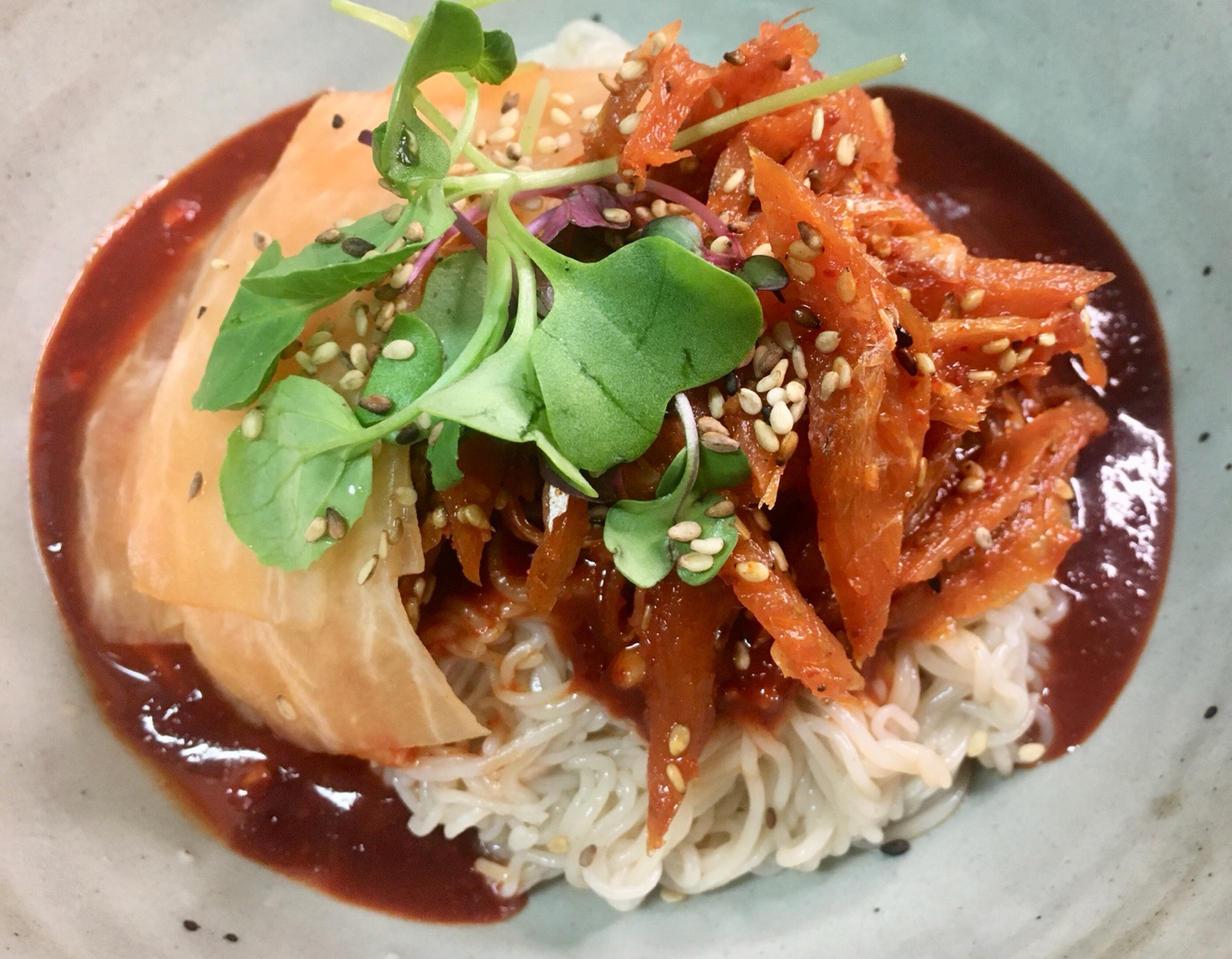 Este bibim naengmyeon presenta abadejo seco (hwangtae) sazonado con una salsa picante de gochujang, y una salsa bibim refrescantemente ácida y dulce hecha con yogur para un perfil de sabor único.