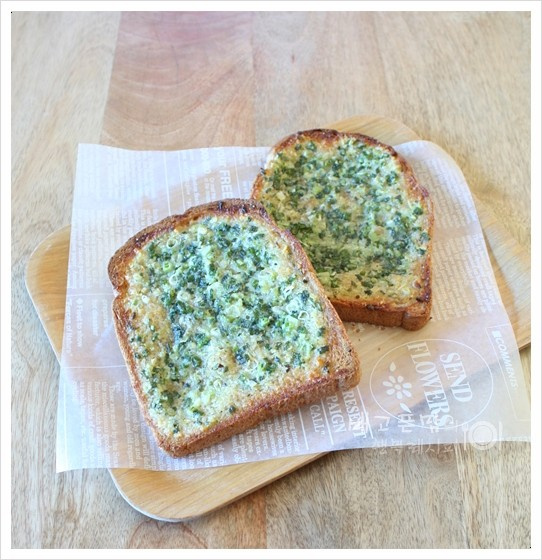 Coloca las 2 rebanadas de pan en un plato. Extiende de manera uniforme y generosa la pasta de mantequilla de ajo y cebolleta recién hecha sobre toda la superficie de cada rebanada de pan. Asegúrate de cubrir los bordes para obtener el máximo sabor en cada bocado.