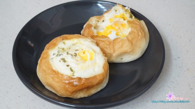 Corta con cuidado la parte superior del panecillo dulce. Luego, usa tus dedos o una cuchara para presionar el interior del pan, creando una forma cóncava como de cuenco. Algunas personas vacían el pan, pero al presionarlo se aprovecha el interior y se crea un soporte perfecto para el huevo. ¡Se convierte en una taza natural!
