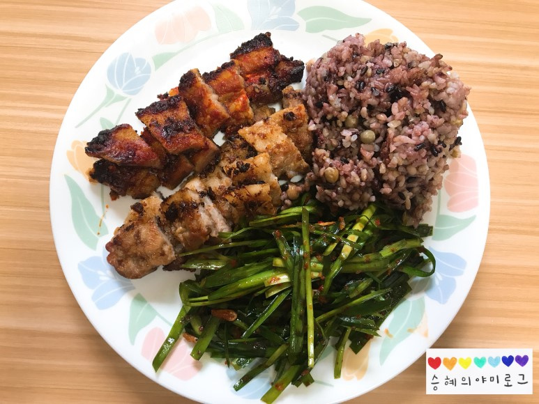 ¿Probemos primero la Panceta de Cerdo Gochujang con Ajo con la ensalada de cebolleta? Esperaba que fuera salada debido al Gochujang, ¡pero sorprendentemente no lo es en absoluto! Es verdaderamente deliciosa. La ensalada de cebolleta en sí tiene un ligero sazón, por lo que cuando se come junto con la panceta de cerdo Gochujang con Ajo, el sazón general está perfectamente equilibrado. Además, el exterior de la panceta de cerdo está maravillosamente crujiente, ofreciendo una textura fantástica.