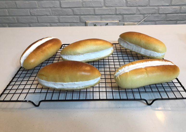Una vez horneados, saca los panecillos del horno y colócalos en una rejilla para que se enfríen por completo. Después de que se hayan enfriado, corta cuidadosamente cada panecillo por la mitad horizontalmente para prepararlo para el relleno.