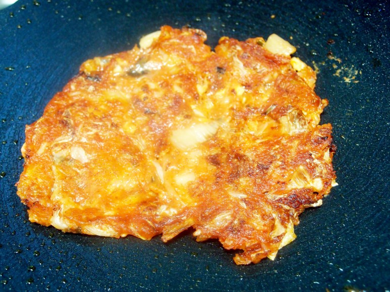 Calienta una cantidad generosa de aceite en una sartén antiadherente a fuego medio-bajo. Sirve una porción de la masa en la sartén caliente y extiéndela finamente con el dorso de un cucharón o espátula. Los panqueques de kimchi contienen mucha humedad, así que ten paciencia y deja que la base se dore y esté crujiente antes de darle la vuelta. Esto asegura que mantenga su forma perfectamente al voltearlo.
