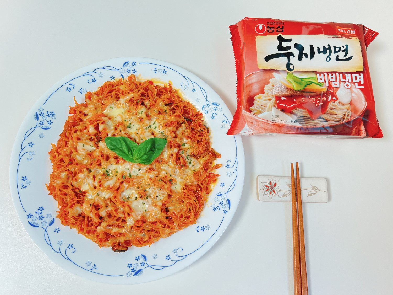 Disfruta de una versión diferente de Bibim Naengmyeon con Nongshim Dungji Naengmyeon: el Panqueque de Bibim Naengmyeon con Queso