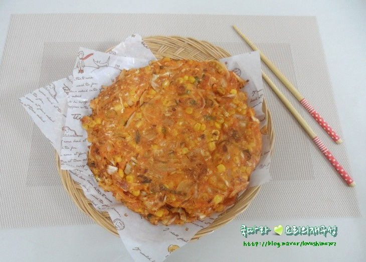 Sirve tu Panqueque de Kimchi con Maíz Dulce perfectamente cocido en un plato. La sutil dulzura del maíz, su sabor salado y el ligero picante del kimchi crean un ‘panqueque de kimchi adictivo’ irresistible. ¡Disfrútalo caliente para obtener el mejor sabor!