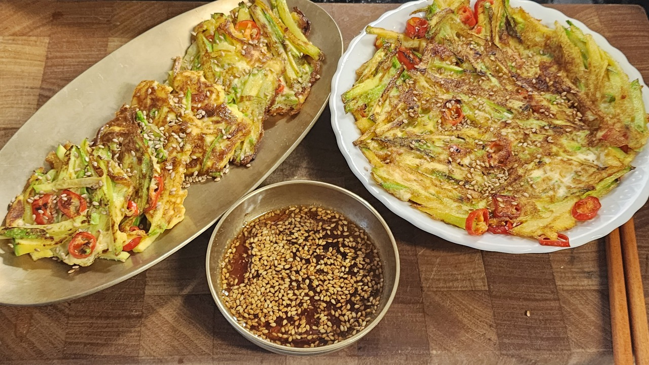 Para un toque extra de sabor, prepara una salsa para mojar. En un bol pequeño, combina 2 cucharadas de salsa de soja, 1 cucharada de mirin (o vino de arroz), 1/2 cucharada de vinagre, un chorrito de aceite de sésamo y una pizca de semillas de sésamo. Mezcla bien hasta que esté todo combinado. Esta salsa sabrosa y ligeramente ácida es el acompañamiento perfecto para los panqueques de calabacín.