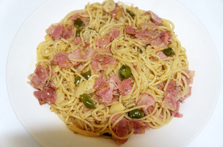 Una vez que el ajo haya infusionado el aceite de oliva con su maravilloso aroma, agregue los chiles Cheongyang picados y el tocino preparado a la sartén. Saltee todo junto. La grasa derretida del tocino, combinada con el ajo y el chile, crea una base sabrosa para su pasta. Su pasta debería estar casi lista en este punto.