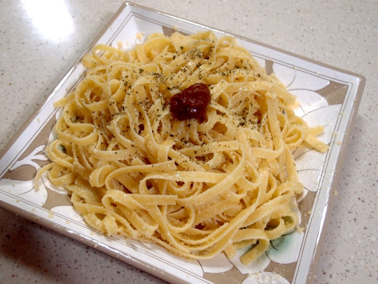 Una vez que el queso Parmesano esté uniformemente incorporado, creando una consistencia cremosa, espolvorea con 1 cucharadita de perejil seco para darle un toque de color. Coloca un trozo de tomate seco en el centro como adorno. ¡Tu auténtica pasta Alfredo al estilo romano está lista! Si la pasta parece demasiado seca, puedes derretir un poco más de mantequilla (unos 5 segundos en el microondas funcionan de maravilla) o rociar un chorrito de aceite de oliva. ¡Disfruta del sabor de Roma en casa!