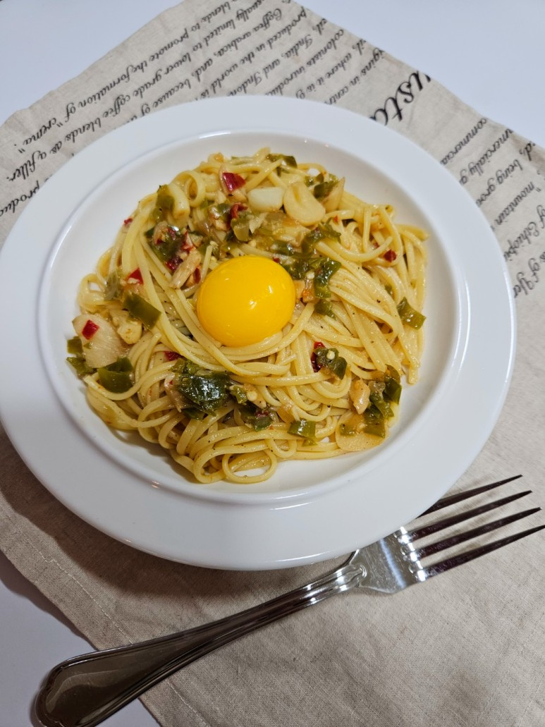Esta Pasta con Chile Salteado terminada ofrece un delicioso aroma picante del chile y una rica fragancia a nuez del aceite de sésamo, creando una experiencia culinaria que rivaliza con cualquier Aglio e Olio. ¡Disfruta de este plato de pasta de inspiración coreana única!