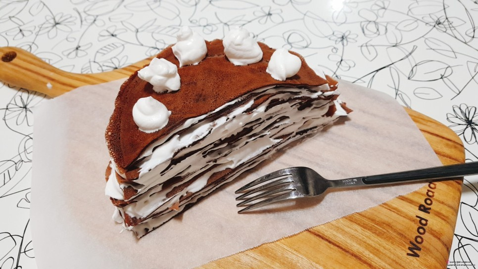 ¡Tu pastel de crepas de chocolate está completo! Puedes terminar con una capa final de crema en la parte superior o dejar la última crepa tal cual. Siéntete libre de decorar con sirope de chocolate o frutas frescas para un toque extra. ¡Disfruta de tu deliciosa creación casera!