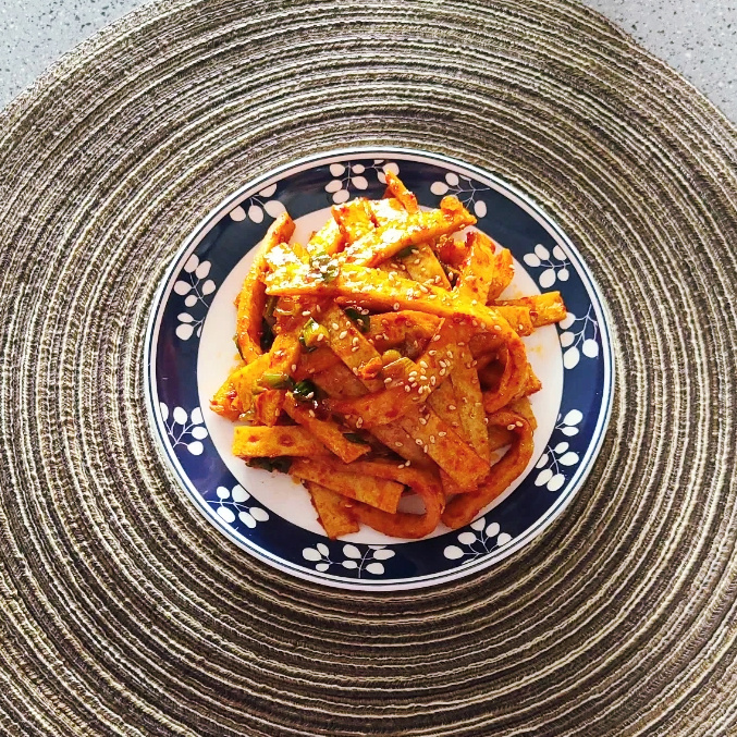 Justo antes de apagar el fuego, espolvorea una generosa cantidad de semillas de sésamo por encima. ¡Tus deliciosos pasteles de pescado salteados picantes y dulces están listos! Disfrútalos con un tazón de arroz caliente.