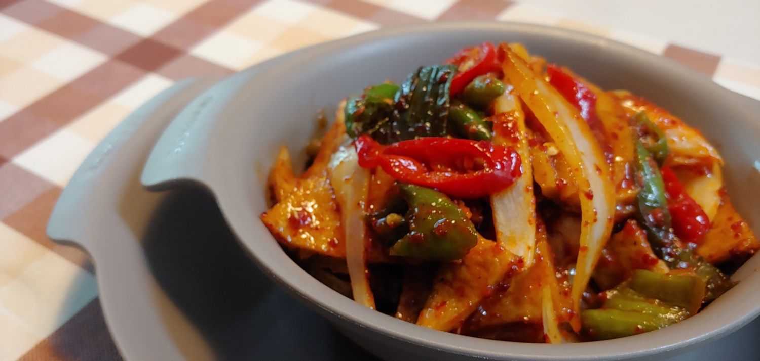 Un Odeng Bokkeum súper sencillo salteado con gochugaru (polvo de chile coreano) y chiles Cheongyang para un toque picante.