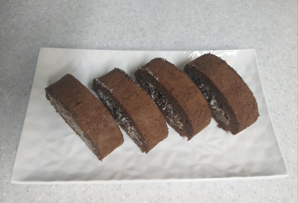 Disfruta de este delicioso pastel roulade, generosamente relleno con galletas Oreo trituradas, que ofrece una experiencia de chocolate perfectamente dulce y satisfactoria. Es un postre ideal para ocasiones especiales o como una deliciosa sorpresa para tus seres queridos.