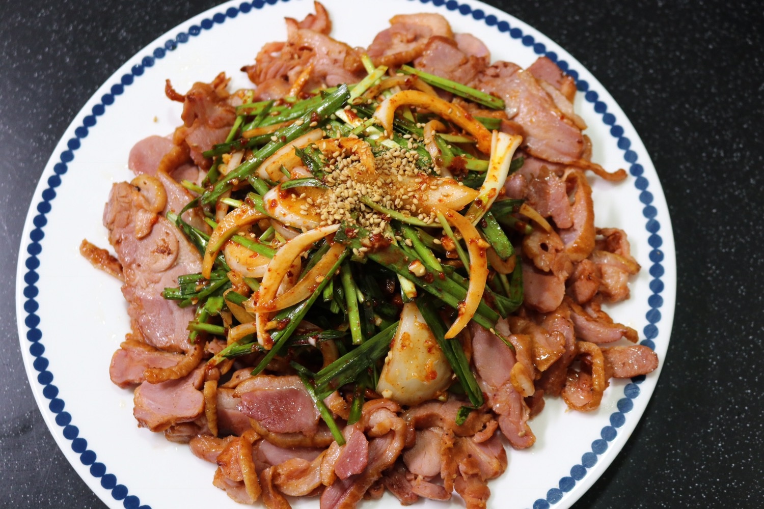 ¡Su Pato Ahumado con Cebolletas Salteadas está ahora completo! Disfrute de la armoniosa combinación del pato sabroso y las refrescantes y ácidas cebolletas.