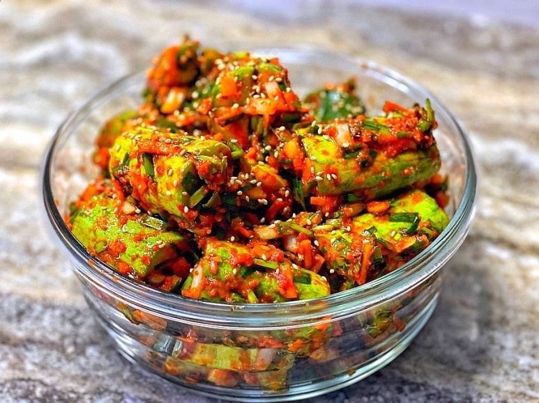Rellena con cuidado el relleno preparado en los cortes en forma de cruz de cada pepino escabechado. Rellena suavemente sin presionar demasiado, para que no se caiga. ¡Tu delicioso y crujiente Oi Sobagi está listo para fermentar y disfrutar!