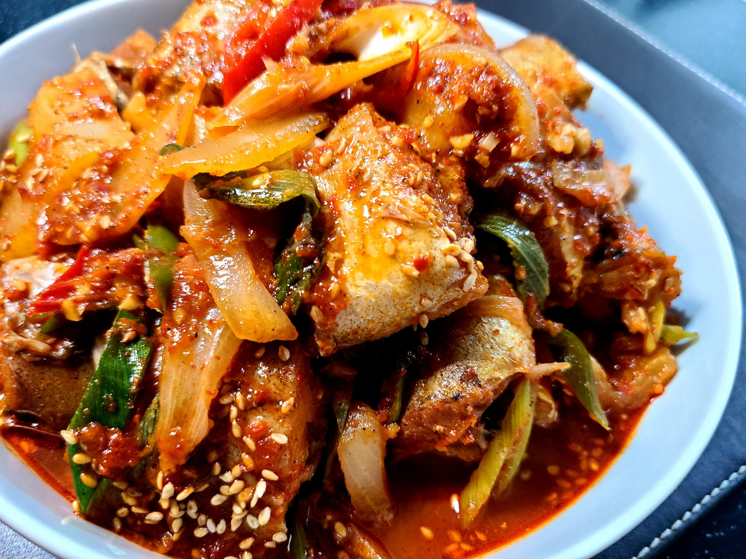 El Kodari (pez volador de cola larga) es un ingrediente muy versátil que se puede preparar de diversas maneras, como guisos picantes, al vapor o con salsa de soja, lo que lo convierte en un plato que no necesita otros acompañamientos y es disfrutado por todos. En comparación con otros pescados, tiene un sabor menos a pescado, lo que lo hace agradable incluso para quienes no disfrutan del pescado. Esta receta ofrece una deliciosa combinación de sabores picantes, dulces y salados. La adición de rábano nabo (mu) aporta una maravillosa dulzura y textura a medida que absorbe la deliciosa salsa. (Receta en video: https://youtu.be/j9pWNevmBdI)