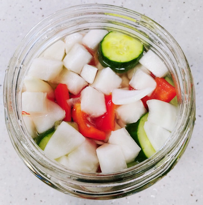 Lava y escurre las verduras preparadas (rábano, pepinos, cebolla, pimientos). Córtalas en trozos del tamaño de un bocado. Puedes cortar el rábano daikon un poco más grueso si lo prefieres.