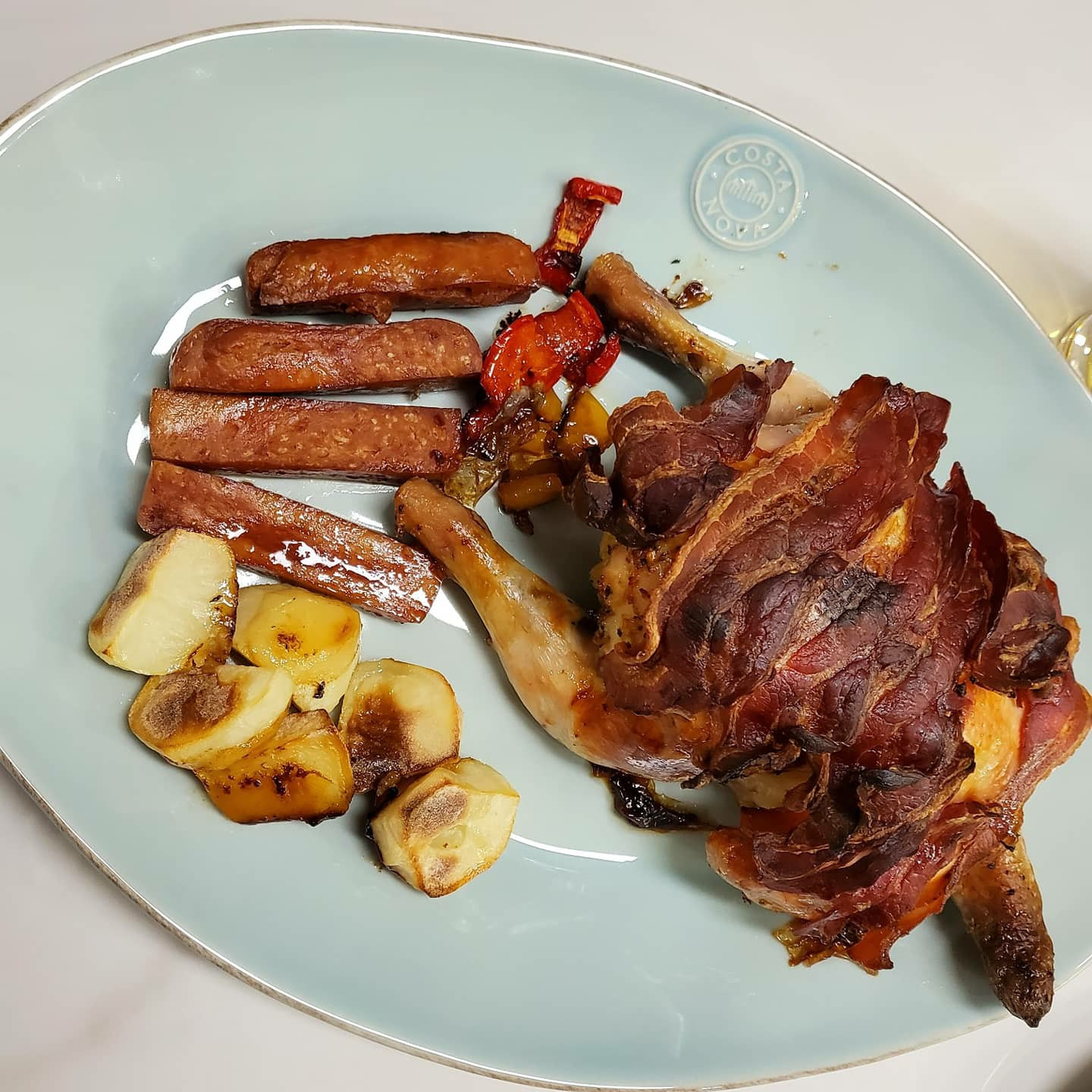 Después de los primeros 10 minutos a alta temperatura, retira el pollo del horno. Coloca las tiras de panceta sobre la parte superior del pollo, cubriéndolo. La grasa y el sabor que suelte la panceta lo untarán mientras se cocina, añadiendo una profundidad increíble. Pela las patatas, córtalas en trozos grandes (cuartos o sextos) y colócalas alrededor del pollo en la bandeja. (Opcional: También puedes añadir otras verduras como Spam o pimientos en esta etapa).