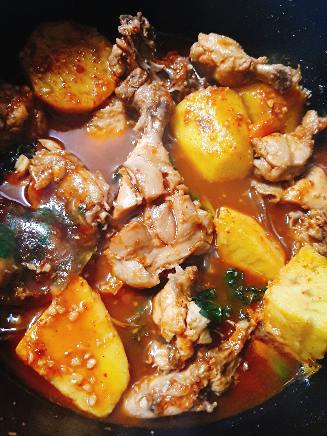 Pollo Guisado Picante con Batatas y Fideos Redondos