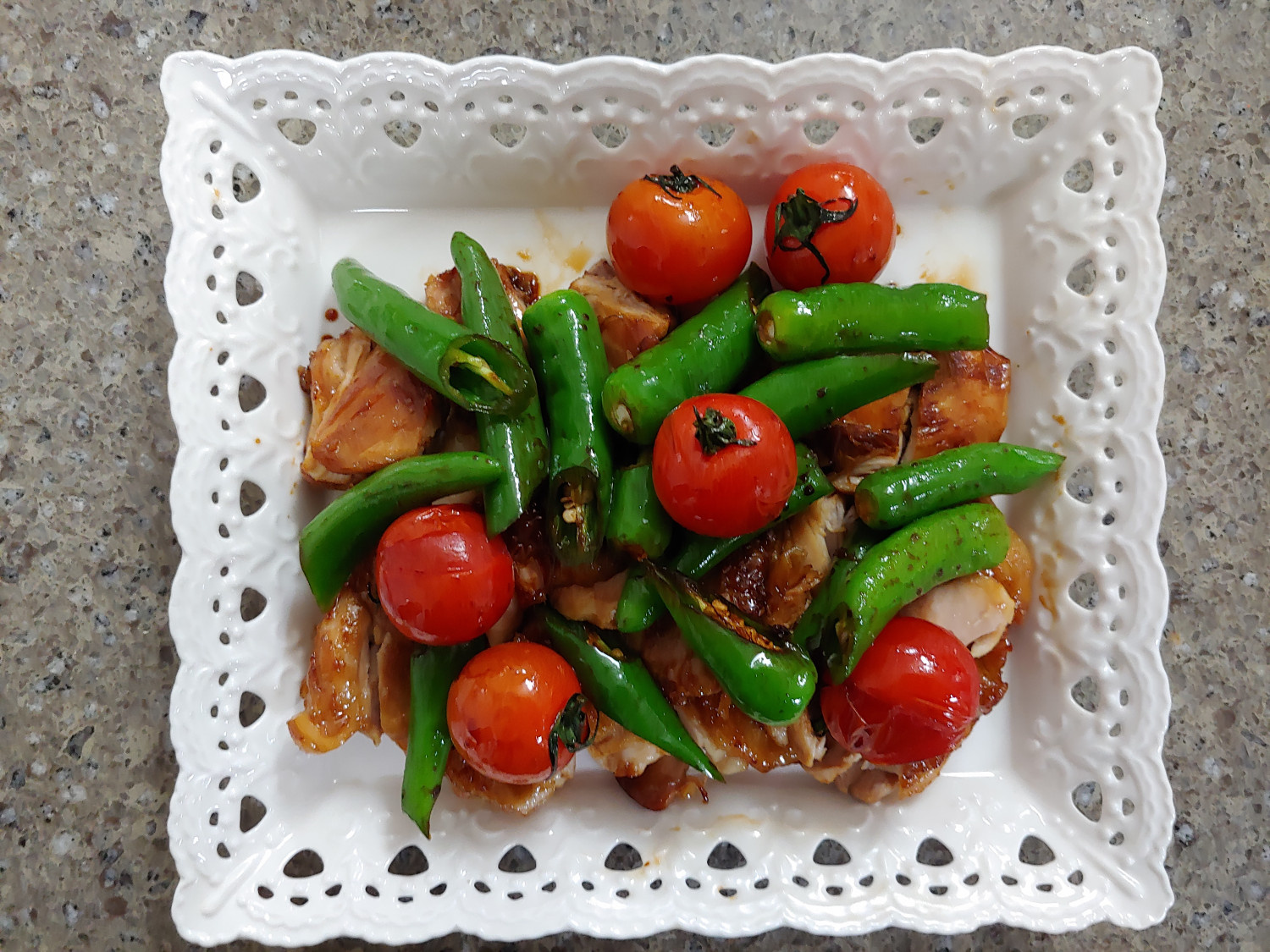 Retire el pollo cocido de la sartén y colóquelo en un plato. Raspe brevemente cualquier salsa restante de la sartén, añada un poquito más de aceite si es necesario y saltee rápidamente los chiles verdes cortados en diagonal y los tomates cherry cortados por la mitad hasta que estén tiernos pero crujientes. Es importante mantener la frescura crujiente de las verduras.