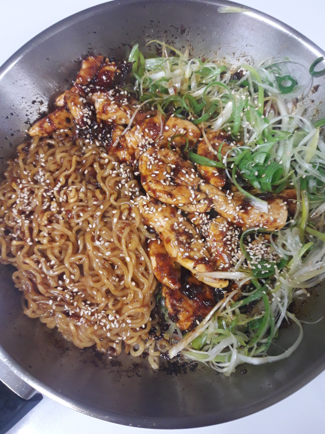 Este es un plato salteado picante y dulce elaborado con tiernos filetes de pollo. La diversión radica en mezclar fideos ramen y cebolla verde rallada, creando una experiencia deliciosa. Es un plato perfecto para ocasiones especiales o como aperitivo sencillo.