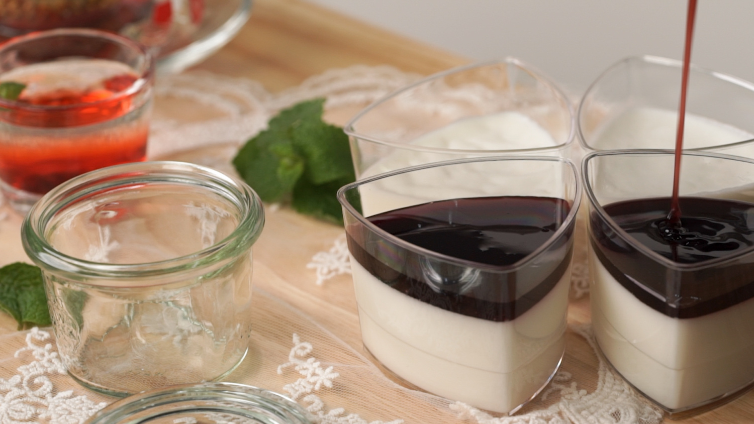 ¡El hibisco, con su cautivadora acidez! Cubra su panna cotta con mermelada de hibisco casera para un postre que es a la vez dulce y ácido. Si bien el hibisco es conocido por sus beneficios para la salud, esta versión en mermelada es tan deliciosa que podría hacerle olvidar la dieta. Disfrute de este manjar refrescante y bellamente equilibrado.