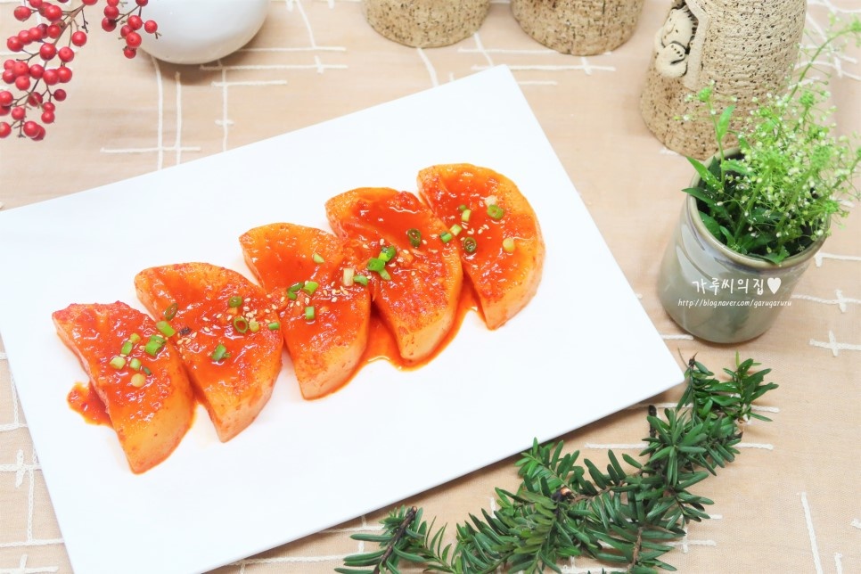 Primero, pela el rábano y córtalo en trozos de aproximadamente 2.5 cm de grosor. Luego, corta cada trozo por la mitad nuevamente. Esto ayuda a que el rábano absorba mejor la salsa, resultando en un sabor más intenso.