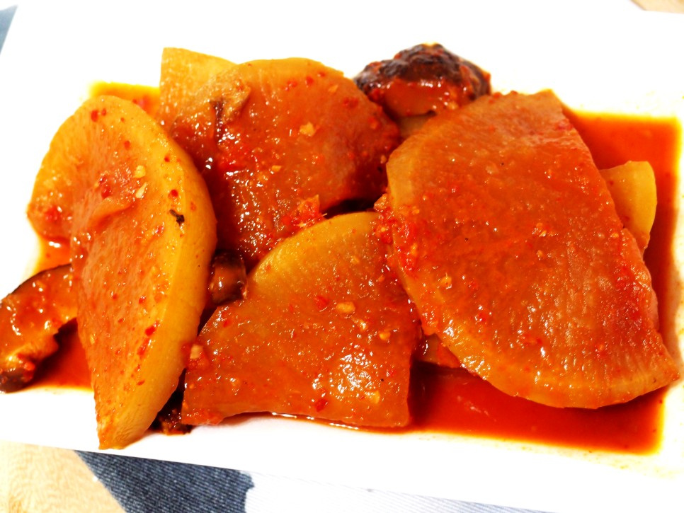 ¡Tu rábano estofado picante-dulce con setas shiitake está listo! Las aromáticas setas shiitake combinadas con la salsa picante y sutilmente dulce crean un plato delicioso que te hará terminar tu cuenco de arroz. ¡También es increíblemente sabroso servido sobre arroz! Disfruta de esta guarnición satisfactoria, ¡tan buena como cualquier pescado estofado!