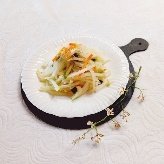 Finalmente, añade las cebolletas picadas y mézclalas con el calor residual después de apagar el fuego. El sutil aroma de las cebolletas infundirá el rábano, haciéndolo aún más delicioso.