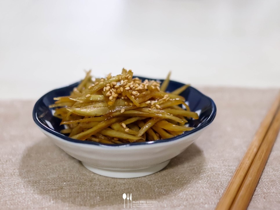 Ahora, calienta una sartén a fuego medio y añade 2 cucharadas de aceite de sésamo (o aceite de perilla) y 2 cucharadas de aceite de cocina (se recomienda aceite de canola), en una proporción de 1:1. Una vez que el aceite esté caliente, agrega la raíz de bardana en juliana. Saltea durante unos 2 minutos, permitiendo que la bardana absorba el aceite. Este paso ayuda a eliminar cualquier olor a crudo y a desarrollar una mejor textura.