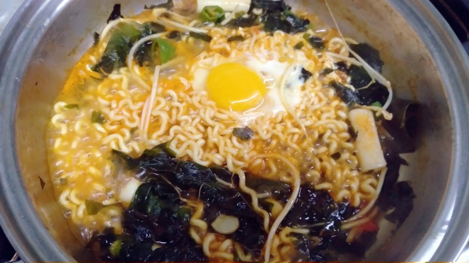 Ahora, agrega tus ingredientes adicionales deseados, como las rodajas de pastel de arroz, el huevo y el chile coreano verde finamente picado. Continúa cocinando por otros 2 minutos, o hasta que los fideos estén completamente cocidos. A medida que las algas marinas se rehidratan y cocinan, absorberán parte del caldo, lo que podría hacer que parezca que se reduce rápidamente. Prueba el caldo y si está demasiado concentrado para tu gusto, agrega 50-100ml adicionales de agua. ¡No te preocupes si no queda mucho caldo; un caldo ligeramente más rico es parte del encanto del ramen de algas marinas!