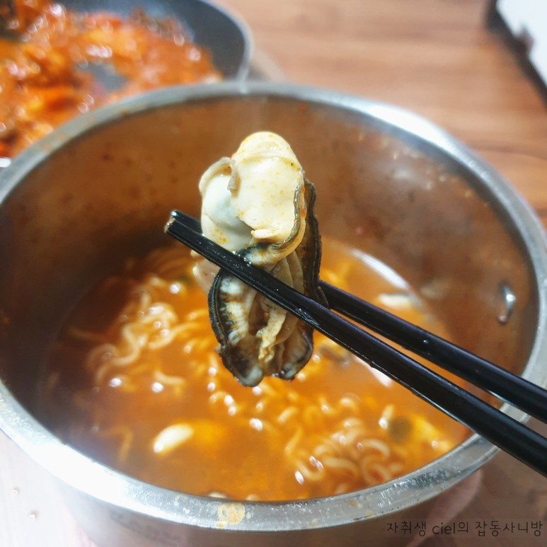 Toques finales y disfrute: Siguiendo el método de Gang Ho-dong, una vez que las ostras se inflen al absorber el caldo (durante unos 8-10 segundos), apaga el fuego inmediatamente y tapa la olla. Mientras se cocinan al vapor, la umami de la ostra y el caldo de ramen se mezclarán, creando un sabor más profundo y refrescante. ¡Disfrútalo mientras esté caliente!