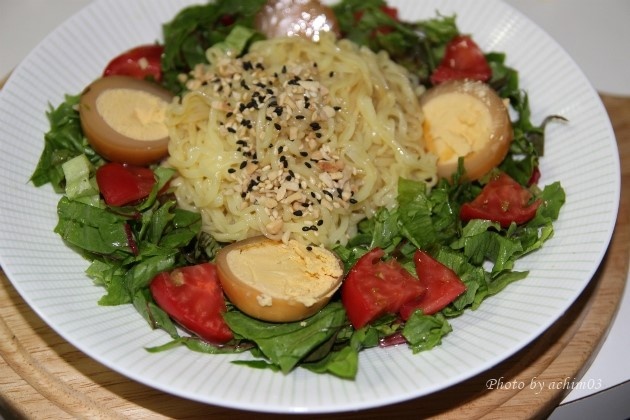 Cuando el hambre aparece tarde en la noche, ¡el ramen es a menudo lo primero que viene a la mente! Si el ramen normal te resulta un poco pesado, prueba este refrescante ramen ensalada con verduras frescas para un tentempié nocturno ligero y delicioso. Usar fideos no fritos lo convierte también en una opción más saludable.