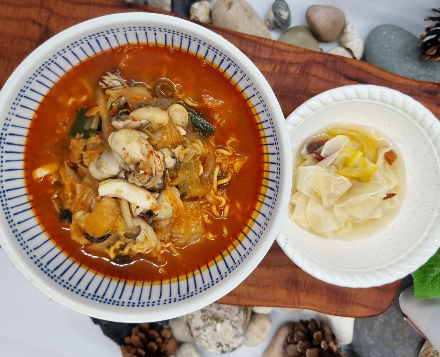 Un delicioso ramen jjamppong de mariscos preparado con frescas ostras de temporada y calamares.