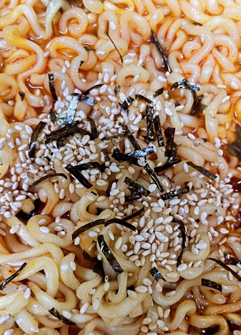 Cuando los fideos estén cocidos a tu gusto (aproximadamente 3-4 minutos), reduce el fuego a medio y deja que el caldo hierva a fuego lento para que espese un poco. Justo antes de apagar el fuego, rocía un poco de aceite de perilla o aceite de sésamo para darle aroma y espolvorea semillas de sésamo tostadas para terminar. Para un toque extra, finaliza con el paquete de hojuelas del Buldak Bokkeummyeon si lo deseas. ¡Disfruta de tu delicioso ramyeon de fusión!