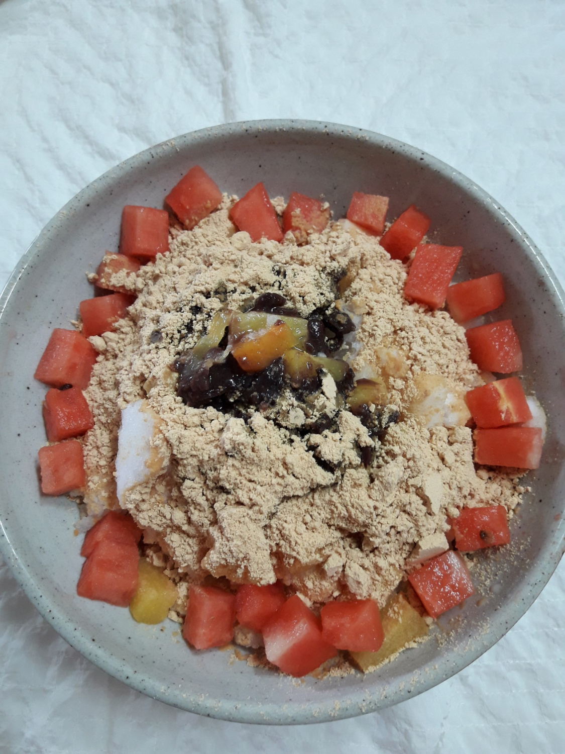 Finalmente, decora tu bingsu con unas cuantas piezas de sandía fría y dulce. Para un toque extra de dulzura, puedes rociar un poco de miel o sirope de maíz por encima, según tu preferencia. ¡Tu delicioso bingsu casero de frijol rojo está ahora completo! Disfruta de esta refrescante delicia.