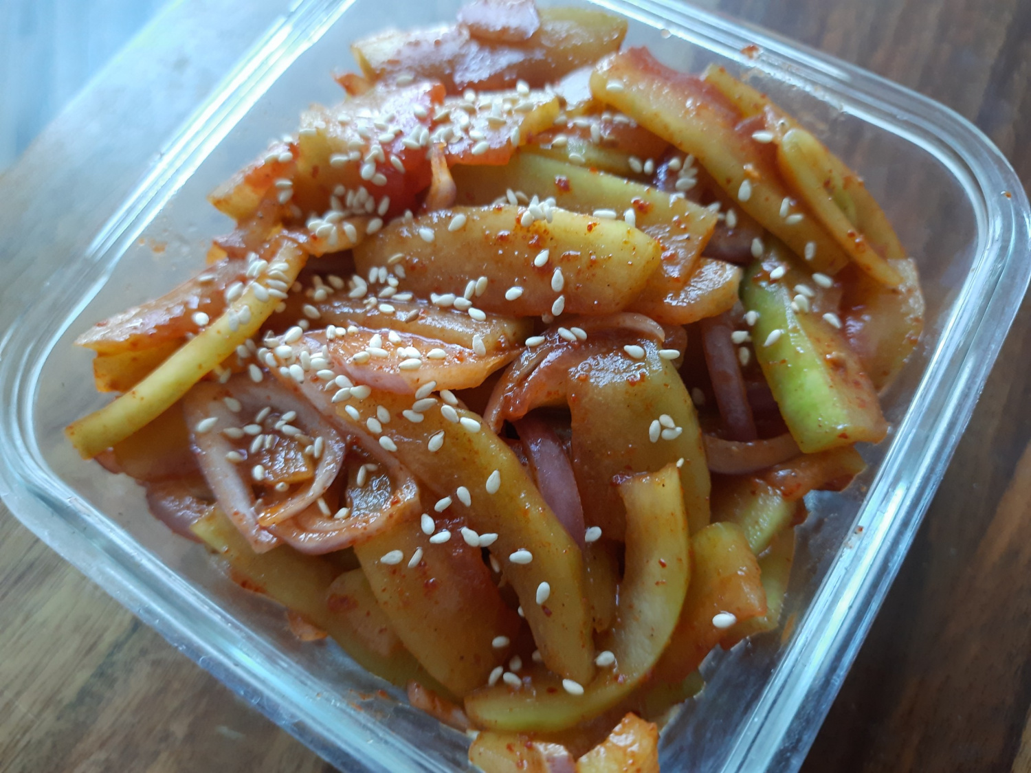 Esta receta transforma la cáscara de sandía, que a menudo se descarta, en una deliciosa ensalada llena de beneficios para la salud. Se sabe que la cáscara de sandía es rica en compuestos beneficiosos que ayudan a la circulación sanguínea y promueven efectos diuréticos. Siguiendo esta receta, podrás disfrutar de un acompañamiento crujiente, dulce y ácido. Es deliciosa para comer inmediatamente, como un kimchi fresco, pero sabe aún mejor si se deja reposar unos días.