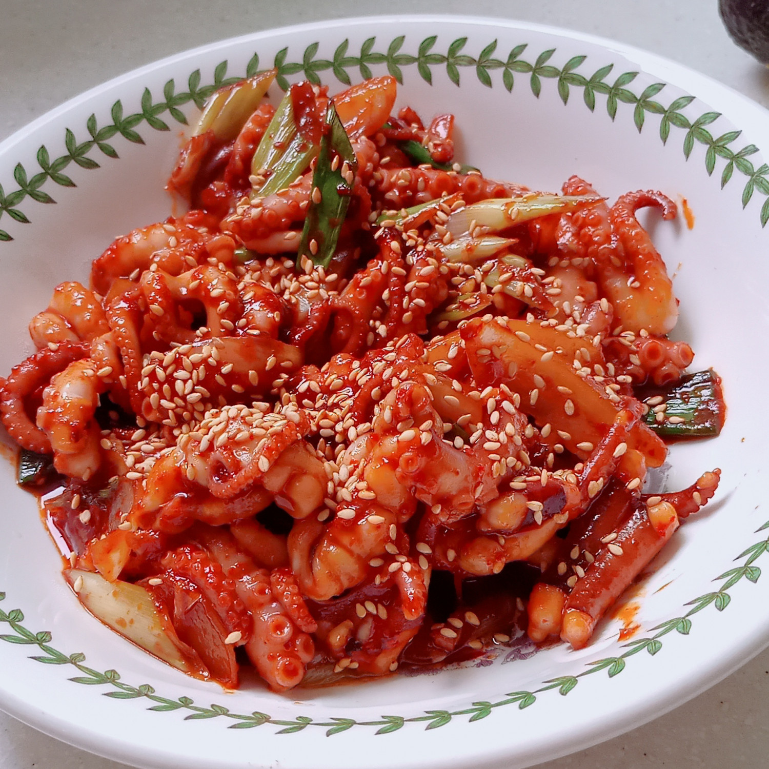 Transfiere el delicioso pulpo salteado a un plato de servir. Rocía un poco de aceite de sésamo para darle más aroma y espolvorea generosamente con semillas de sésamo. Sírvelo con arroz caliente cubierto con algas secas (gim), o disfrútalo con un refrescante acompañamiento de kimchi. ¡Este plato es una forma perfecta de combatir el calor del verano!
