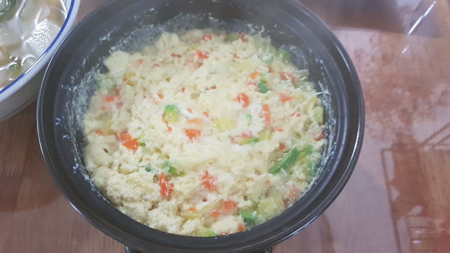 En un tazón grande, rompa los 4 huevos. Agregue toda la cebolla, zanahoria y calabacín finamente picados. Sazone con 1/2 cucharadita de sal o 1 cucharadita de pasta de camarones fermentada para una capa adicional de umami. Vierta el caldo preparado (o agua) y mezcle suavemente todo con un palillo de madera largo o un tenedor hasta que esté bien combinado y no queden grumos.