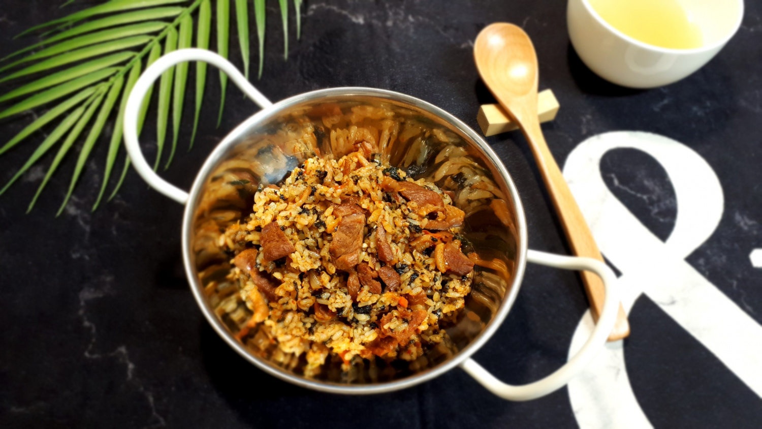 Una vez que el duck bulgogi esté suficientemente cocido, agrega el arroz cocido a la sartén. Luego, añade el jaban kim desmenuzado (o alga sazonada), furikake y pimienta negra a tu gusto. Si prefieres un arroz frito más picante y sabroso, ¡agregar un poco de kimchi añejo finamente picado en este momento es muy recomendable y delicioso!