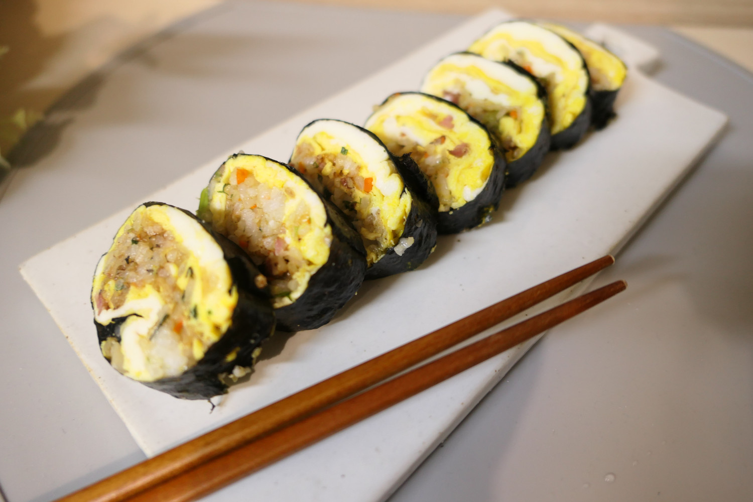 Coloca una cantidad adecuada del arroz de dumplings salteado cubierto de huevo sobre una lámina de alga nori (kim) y enróllalo firmemente para formar una forma de kimbap. Usar una esterilla de kimbap te ayudará a hacerlo más firme y visualmente atractivo. Corta el kimbap terminado en trozos del tamaño de un bocado y disfruta. ¡También es un excelente snack nutritivo para los niños!