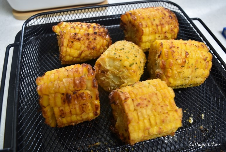 Si usas una freidora de aire, precaliéntala a 180°C (350°F). Coloca los trozos de maíz untados con mantequilla dentro y hornea durante 15 minutos por cada lado, dándoles la vuelta a mitad de cocción, para un total de 30 minutos hasta que estén dorados. Si usas un horno convencional, precaliéntalo a 180°C (350°F) y hornea durante unos 10-15 minutos, o hasta que la superficie tenga un hermoso color marrón dorado. Vigílalo para evitar que se queme.