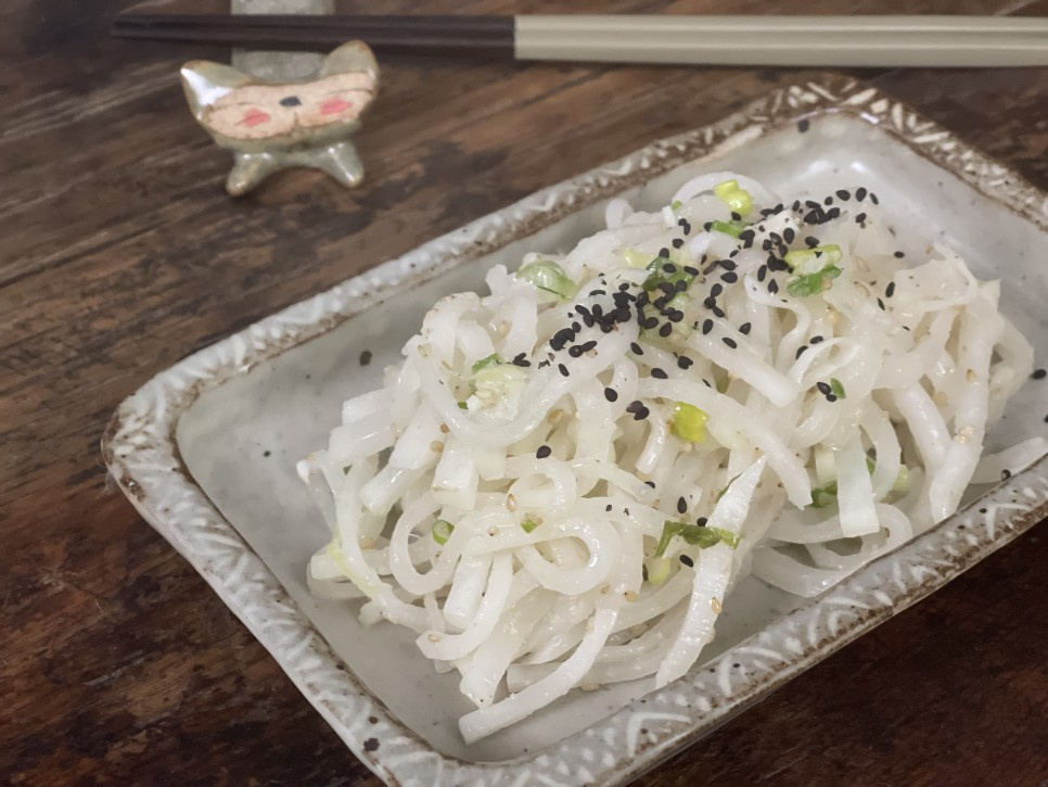 Calienta aproximadamente 2 cucharadas de aceite de cocina en una sartén a fuego medio-bajo. Añade el rábano en juliana y sofríe. Mantener el fuego moderado evita que el rábano se queme y asegura que se cocine bien. Una vez que el rábano empiece a verse ligeramente translúcido, añade la sal para sazonar. Ajusta la cantidad de sal según la dulzura natural del rábano y tus preferencias personales.