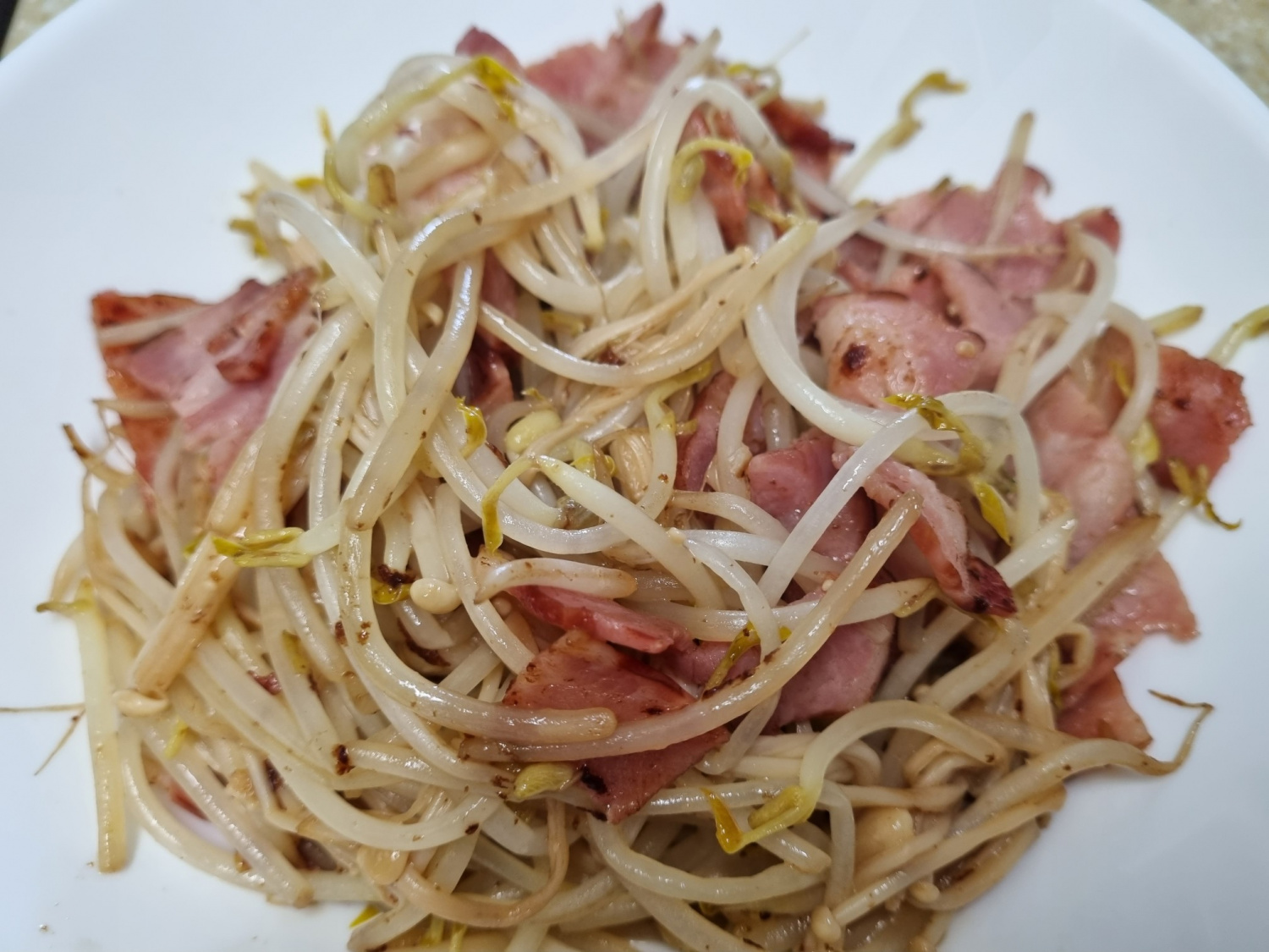 Una guarnición rápida hecha con brotes de soja y tocino de tu refrigerador~